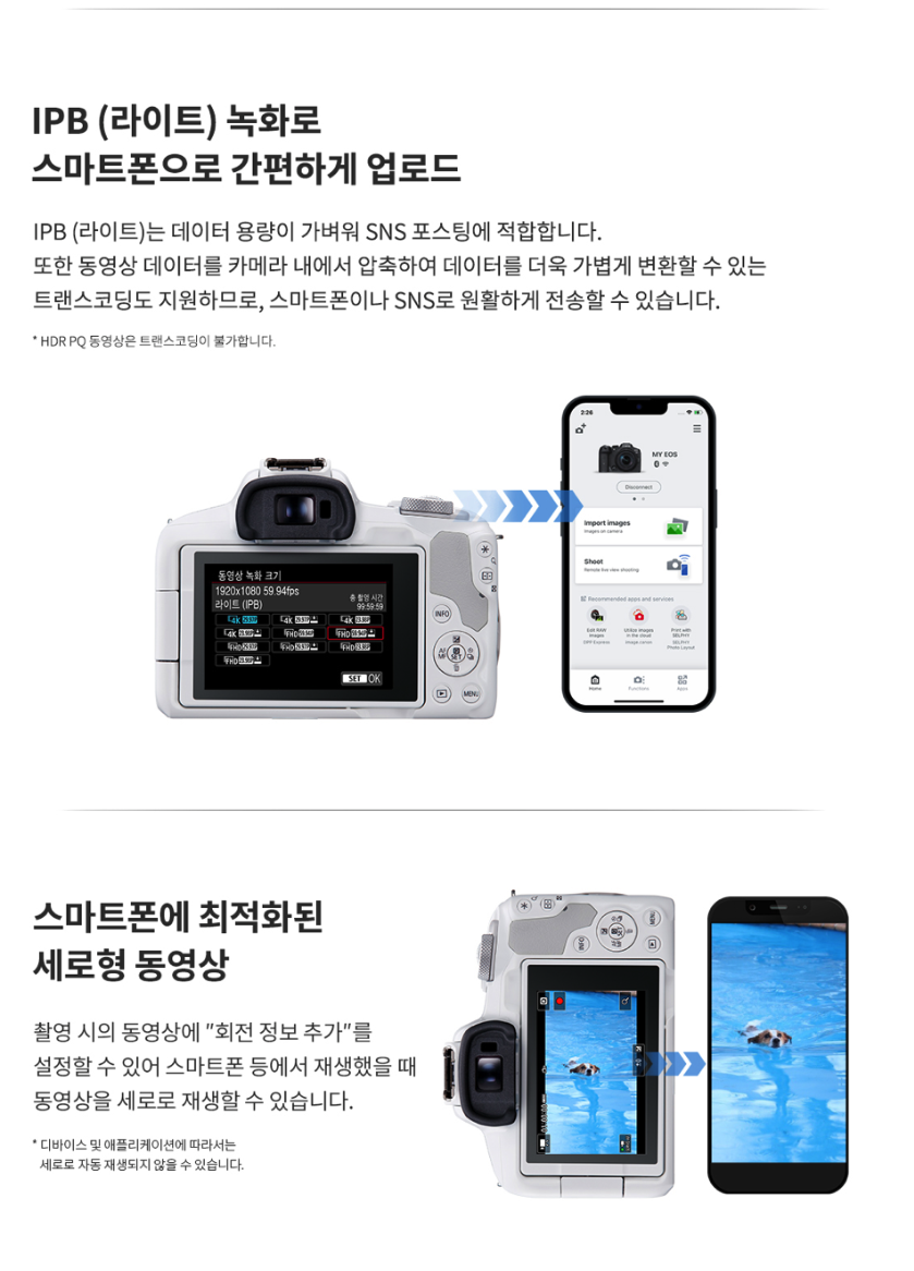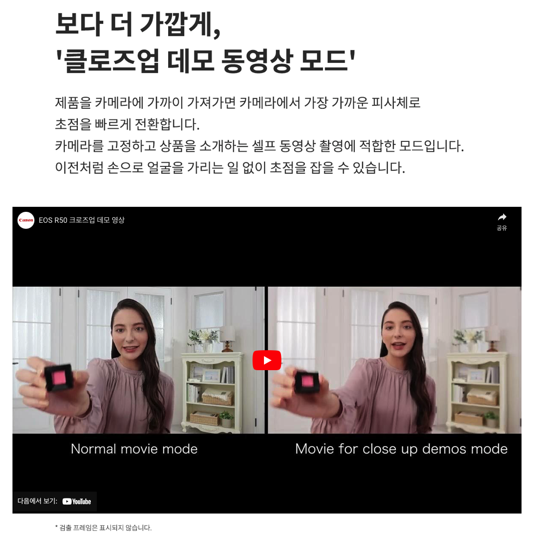 캐논에서 R50 에 대해 광고할 때 나타내는 것을 보면 R50 모델은 스마트폰을 사용하다가 뭔가가 아쉬워 하는 부분을 긁어주는데 공을 많이 들였다는 생각이 든다. 클로즈업 데모 동영상 모드 도 마찬가지다. 기존에 뷰티 영상을 제작하시는 분들께 매우 효과적인 기능이 될 것으로 예상한다.
