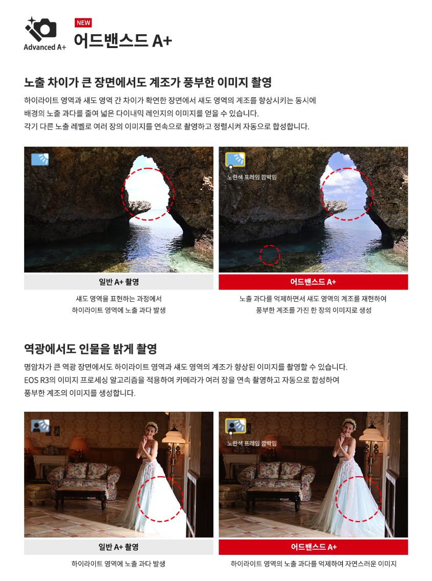 이번에 새롭게 출시된 어드밴스드 A+ 인데 이 부분이 조금 전에 말했던 것 중 하나다. 스마트폰의 사진은 어두운 부분과 밝은 부분의 노출이 사람이 보는 것과 최대한 비슷하게 하는데 카메라는 그렇지 못하다. 그래서 조명을 터트리면서 촬영하고는 하는데 이번 R50 에서는 어드밴스드 A+ 로 노출차이를 극복하려는 것을 보여준다. 사용해 봐야 알겠지만 이 기능은 초보자에게 매우 편리한 기능이 될것같다.