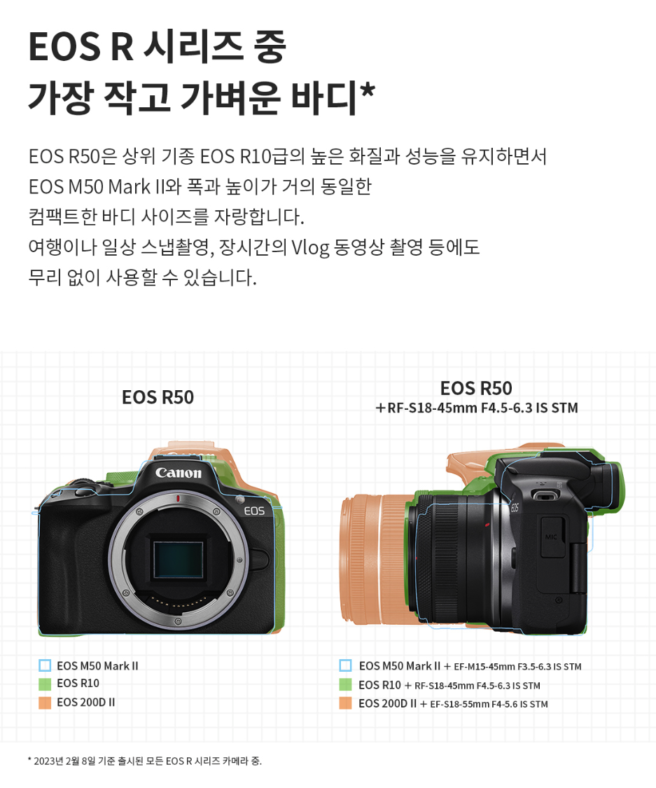캐논의 R 시스템 바디가 새롭게 출시된다. EOS R8 과 EOS R50. 캐논의 바디 숫자는 낮을 수록 고급기종이다. R50 은 기존의 200D 의 계보를 잊는다고 보면 되겠다. 사실 고민을 하고 있었는데 그것은 나온지 오래 된 캐논 5D mark2 를 구입할것이냐 R50 을 구입할 것이냐 이다. 왜 이런 고민을 하게 되었냐면 R50은 크롭바디이기 때문이고 사진을 알려줄 동생이 풀프레임 바디에 50mm 렌즈만을 사용해서 사진을 알려주고 싶었기 때문이다. 보통은 그렇게 사진을 배우니까. 그럼에도 R50 을 이번에 구입하려고 한 이유가 있다. 그것에 대해서 알려주겠다.