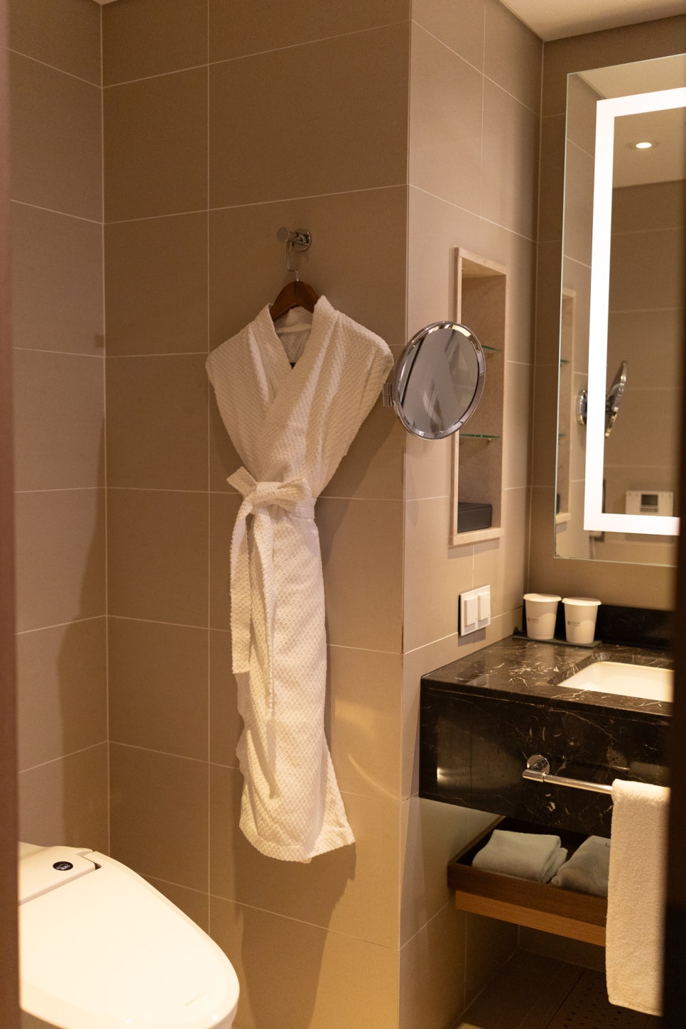 객실은 깔끔했고, 시설도 준수했습니다. 특히 화장실은 뜨거운 물이 잘 나와서 만족스러웠어요. 다만 샤워기가 조금 낡은 탓인지 물줄기가 약했는데, 이건 교체하면 해결될 문제라 크게 신경 쓰이지 않았습니다.