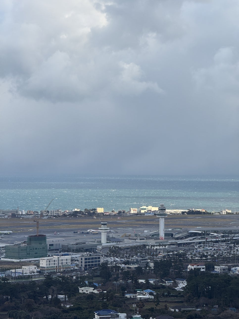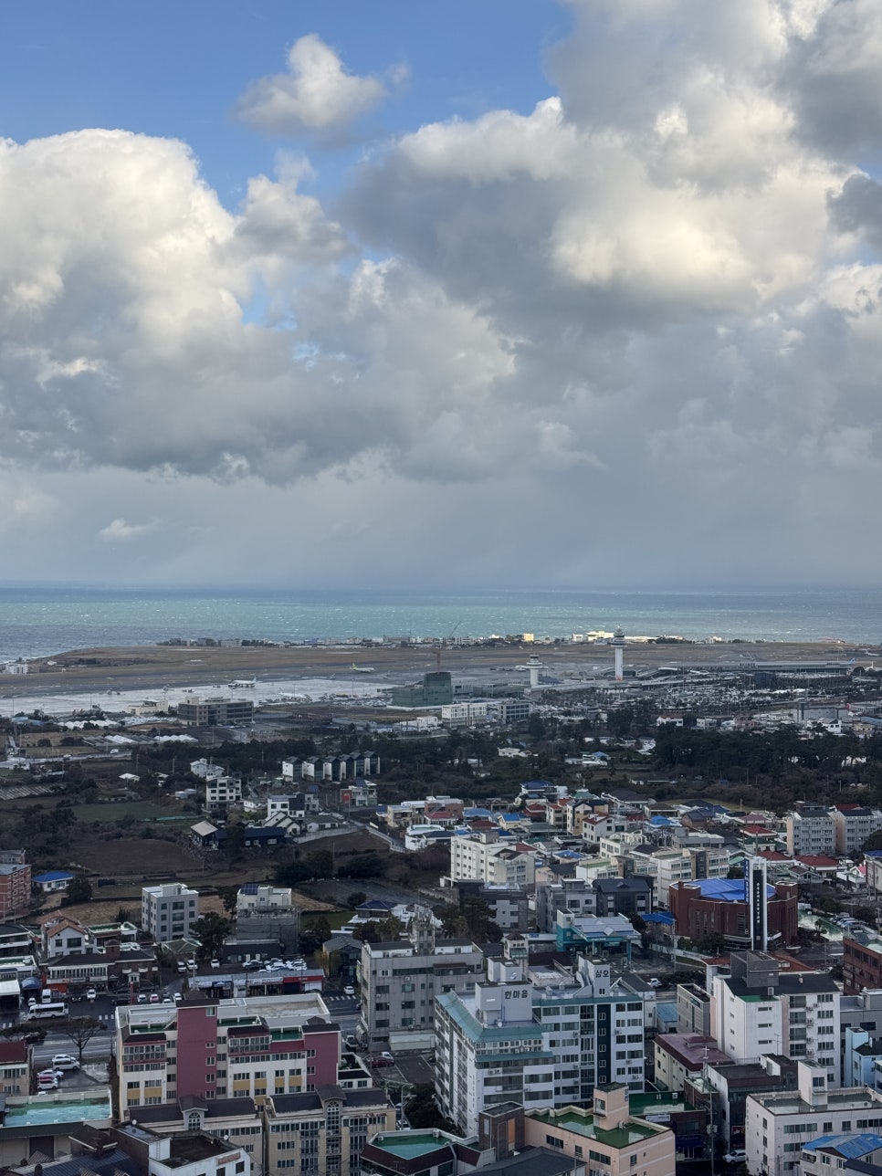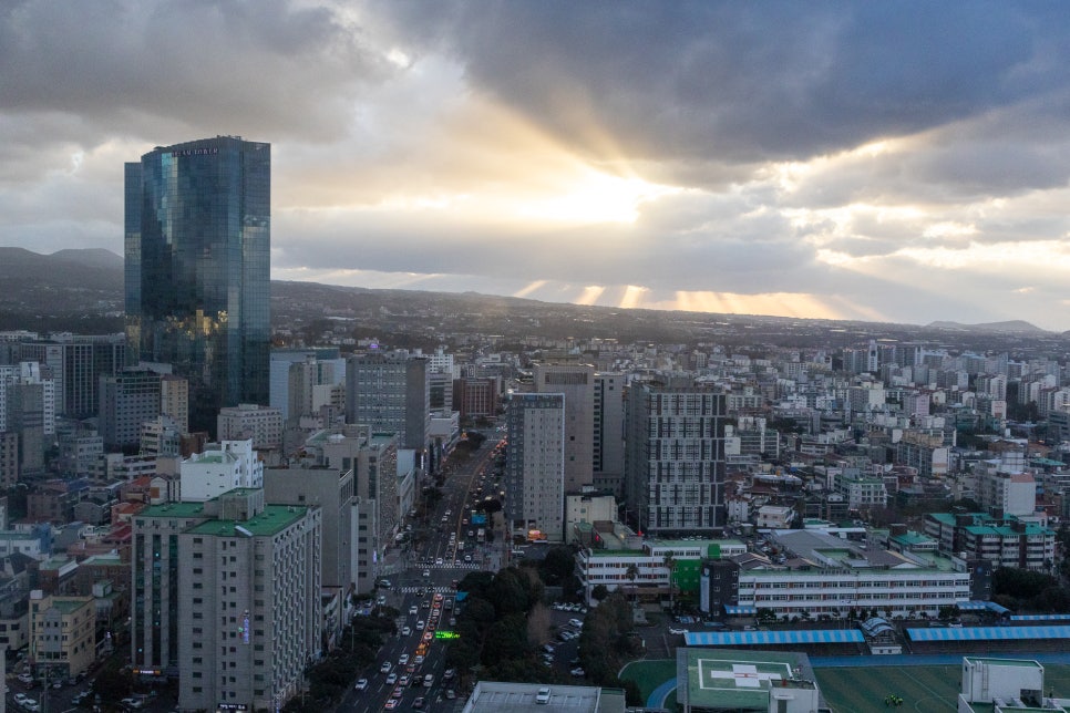 2. 높은 층에서 즐기는 멋진 뷰 – 제주 도심과 바다가 한눈에 보이는 풍경은 큰 장점이에요.