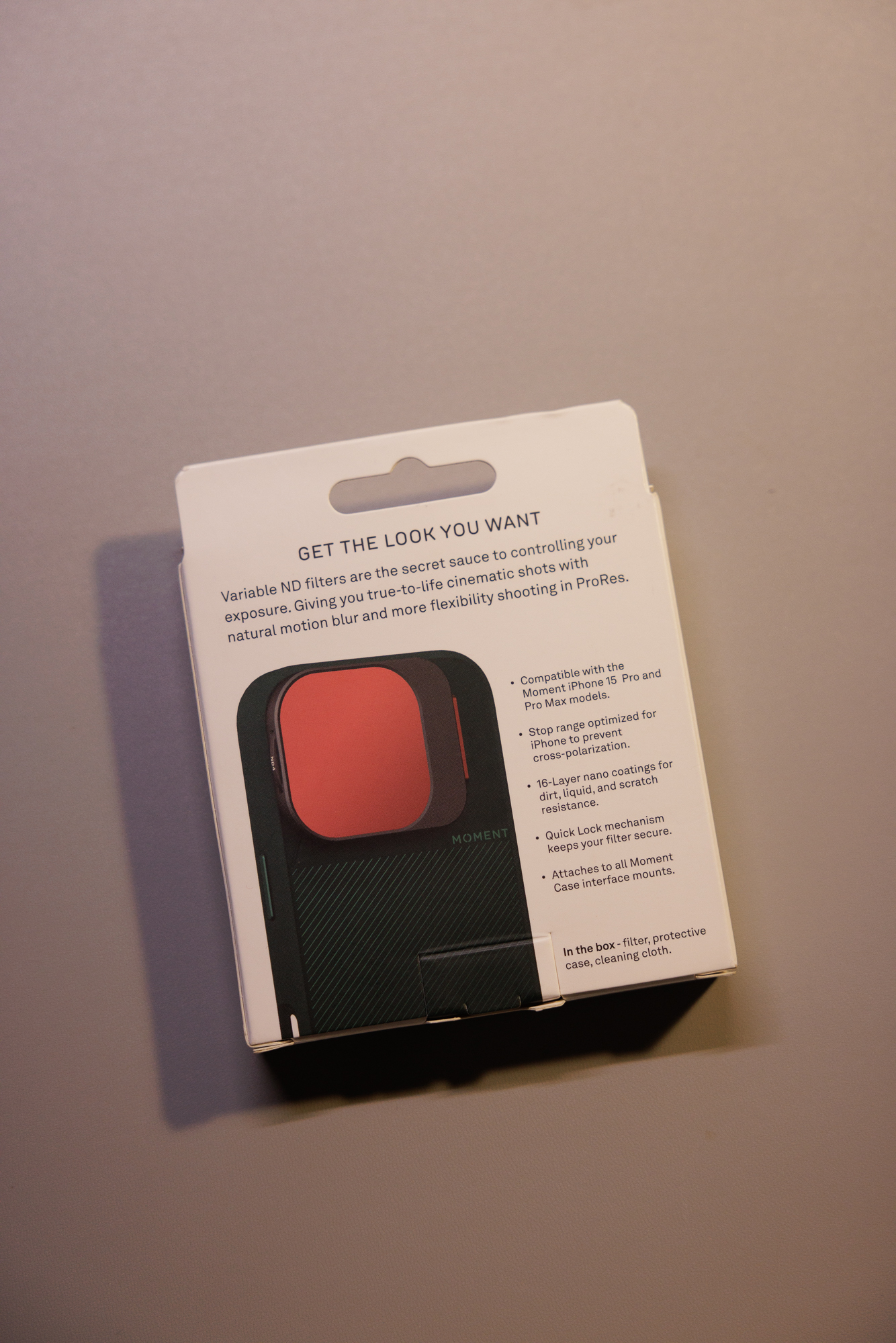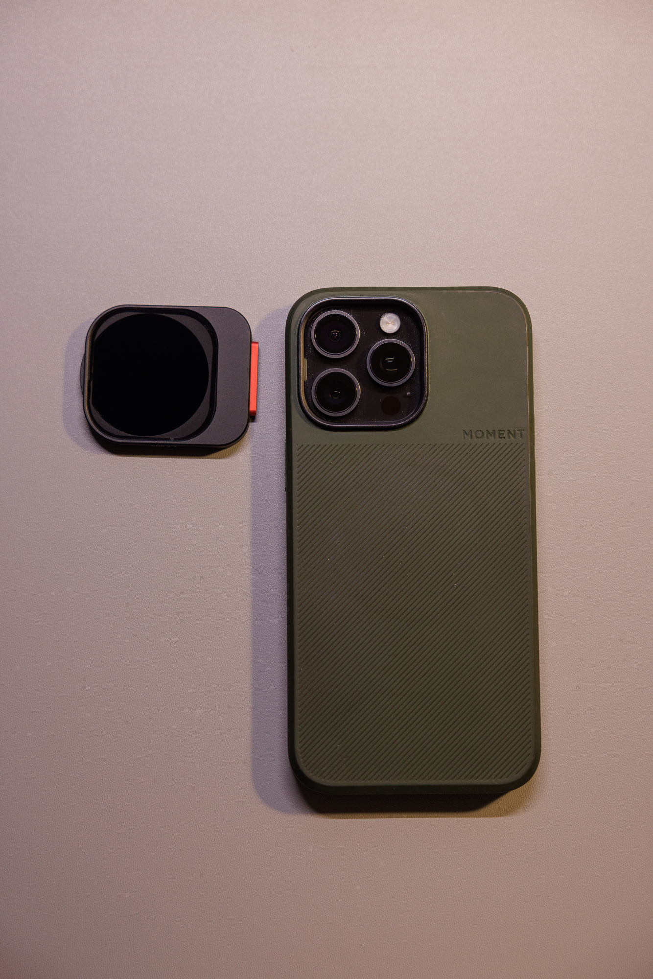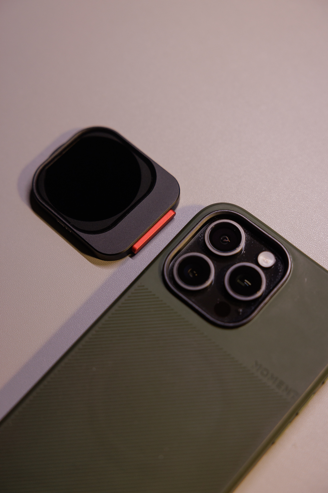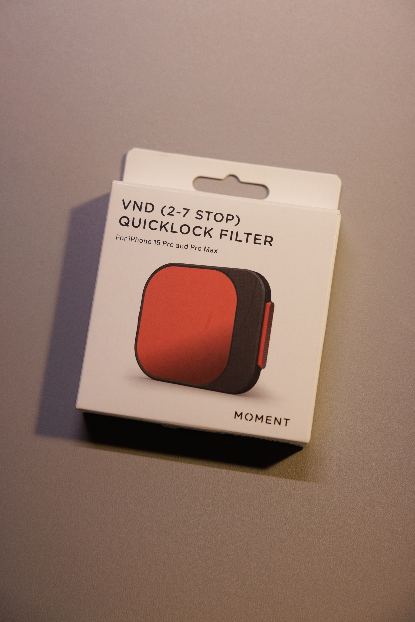 모멘트 전용케이스를 열면 VND 필터가 있습니다. 꽤 고급스럽게 보이죠? 현재 이 필터는 아이폰 15,16 프로,맥스 전용으로만 나와있습니다. 다른모델은 착용이 불가합니다. 사진을 자세히 보면 빨간색 버튼은 장착해제할때 누르는 것이구요, ND4-128 까지 됩니다. 왠만한 촬영때 사용할수가 있습니다.
